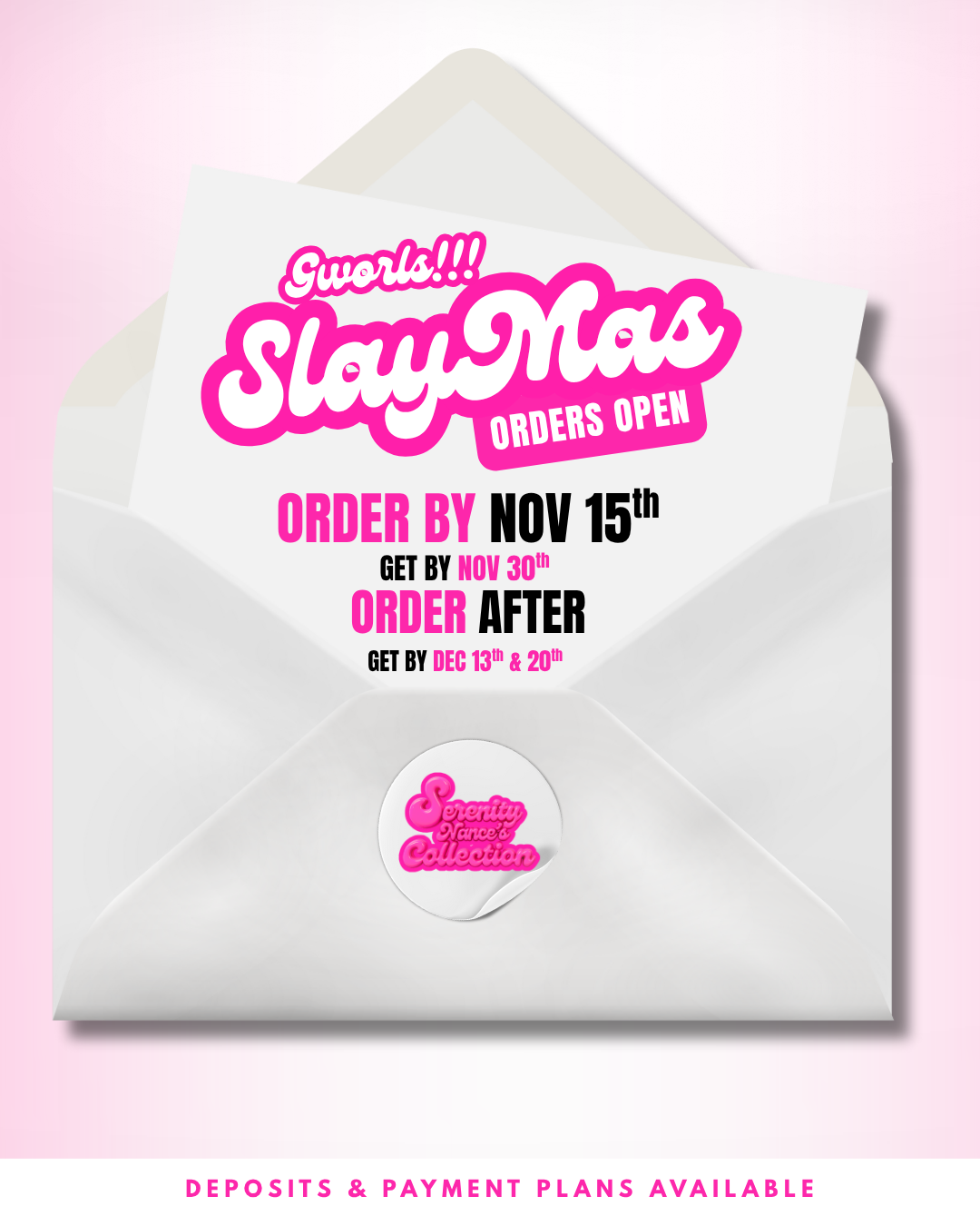 Secure your order now and avoid the holiday delays. Deposits and Payment Plans are available.
